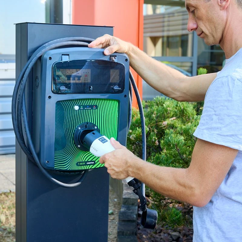 Prêt à l’emploi, le boîtier électrique est pré-câblé. Ce coffret de recharge est muni d’un contrôleur qui communique avec le véhicule et qui active le contacteur de puissance intégré pour réaliser la recharge électrique. Ce coffret comprends également l’ensemble des protections électriques, à savoir un interrupteur différentiel type B et différents disjoncteurs de protection pour protéger l’ensemble du système de recharge.