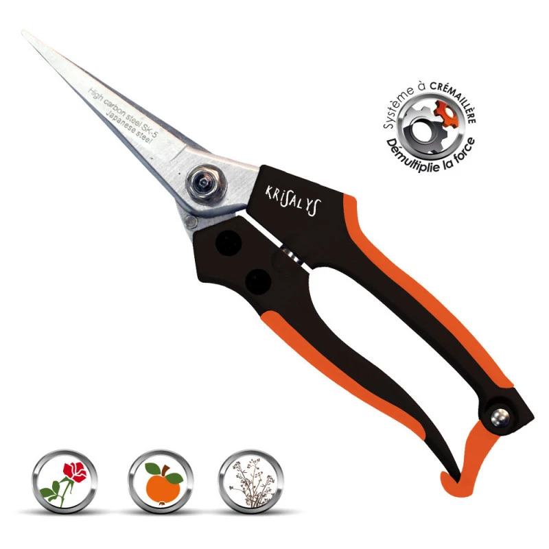Ciseau de jardin, avec système de fermoir. Lame tranchante en acier au carbone SK5. Poignée en aluminium avec fini antidérapant.
