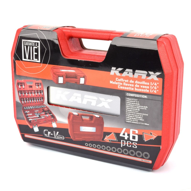Ce coffret pratique de 47 pièces composés de différents embouts et douilles, clés, cliquet et porte-douille sera parfait pour l’équipement de votre atelier. Il viendra compléter votre caisse d’outils pour tous vos travaux quotidiens.