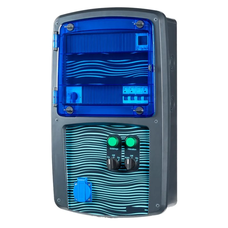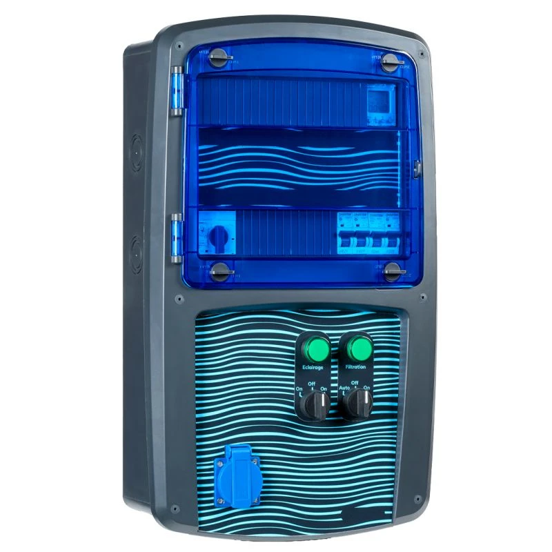 Tableau électrique piscine robuste, étanche et très pratique. Prêt à l’emploi, le boîtier électrique piscine est pré-câblé. Avec ce coffret, vous pouvez pilotez les fonctions principales de votre piscine (filtration, projecteurs 12V) et protéger efficacement vos équipements électriques. Volet transparent résistant pour une visualisation rapide et permanente de votre installation. Sélecteurs en façade pour un confort et un voyant pour une visualisation de l’état de fonctionnement. Un sélecteur 3 positions donne la possibilité de faire fonctionner la pompe de filtration en mode marche forcée/OFF/programmation. Un sélecteur 2 positions permet d’activer ou désactiver le circuit d’éclairage.