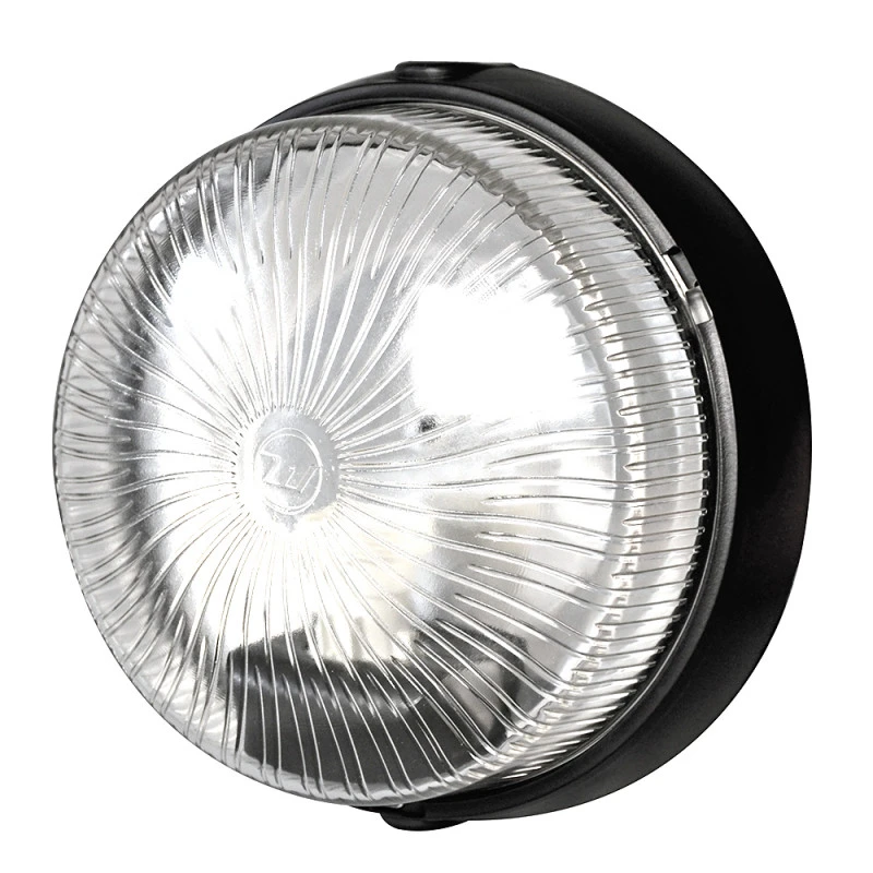 Hublot extérieur rond noir, idéal pour éclairer le patio, la terrasse ou le garage. Installation en plafonnier ou applique murale. Luminaire extérieur simple, économique et efficace.