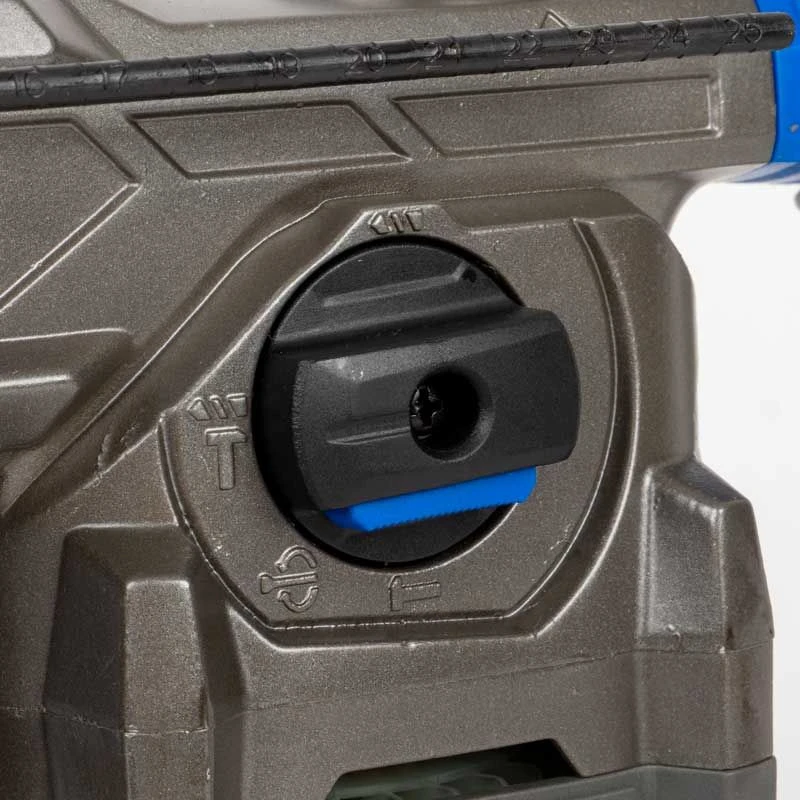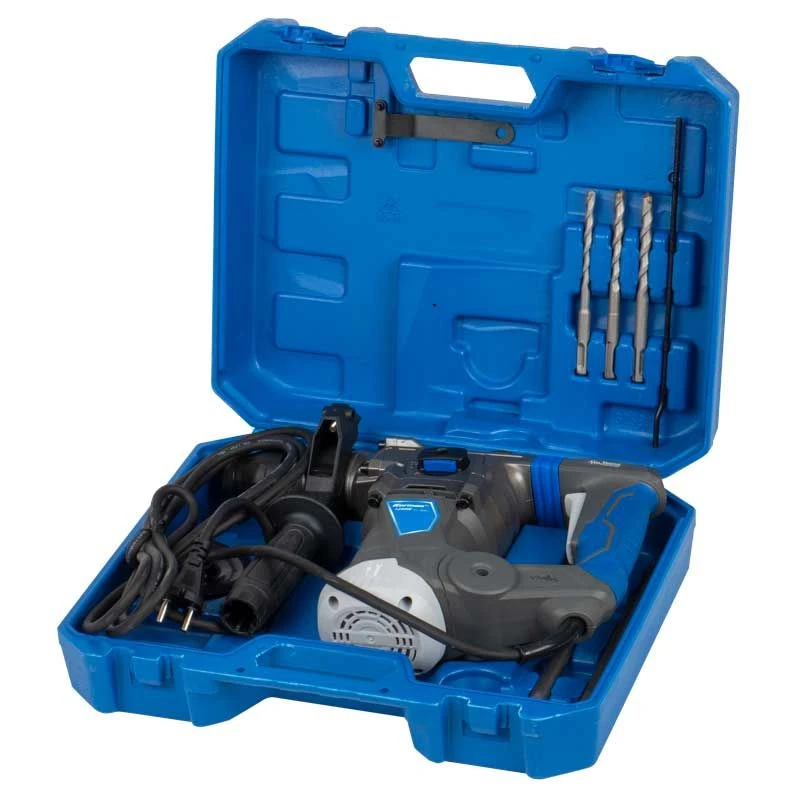 - + produit– Mandrin SDS+ avec système de changement rapide des accessoires- Capacité de perçage max : béton 30mm, bois 40mm, métal 13mm- Bouton de blocage du sélecteur de fonction et du réglage de la position du burin- Témoin d’alimentation pour plus de sécurité- Débrayage de sécurité- Poignée principale avec système anti-vibration- Poignée auxiliaire rotative à 360°- Trappe d’accès direct au graissage- Carter en aluminium- Butée de profondeur- Protection anti-poussière