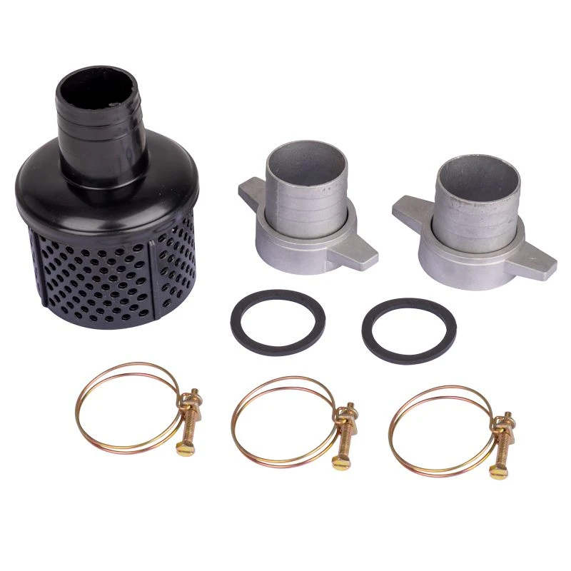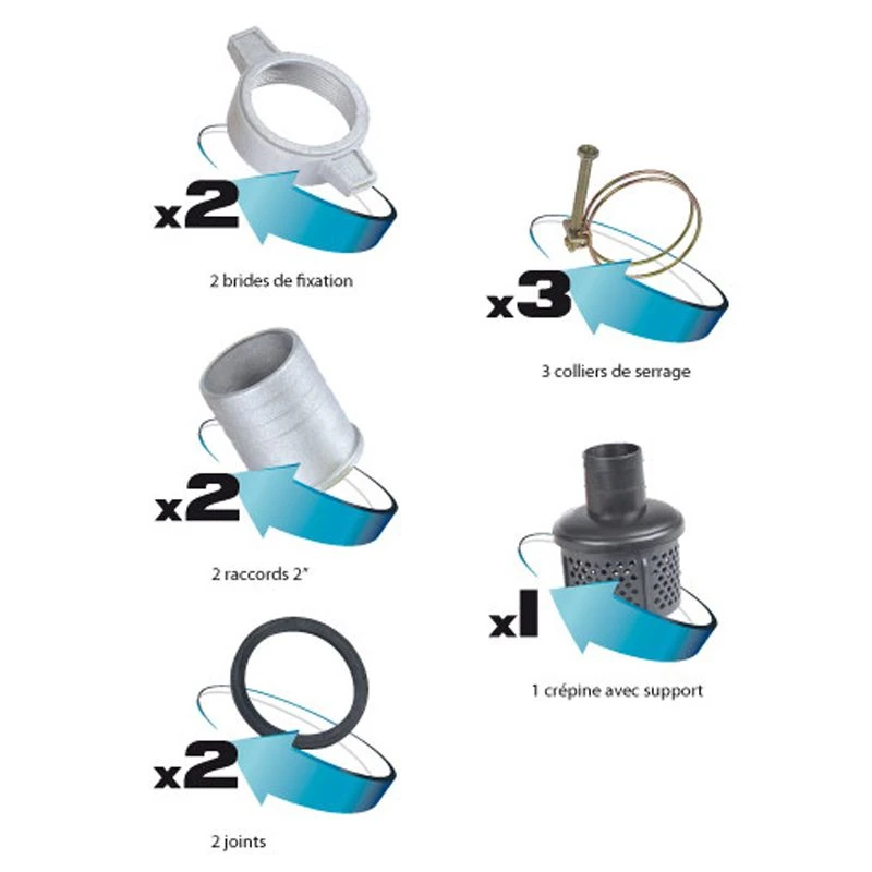 - Accessoires2 raccords Ø50mm avec brides de fixation et colliers de serrage, 1 crépine avec support