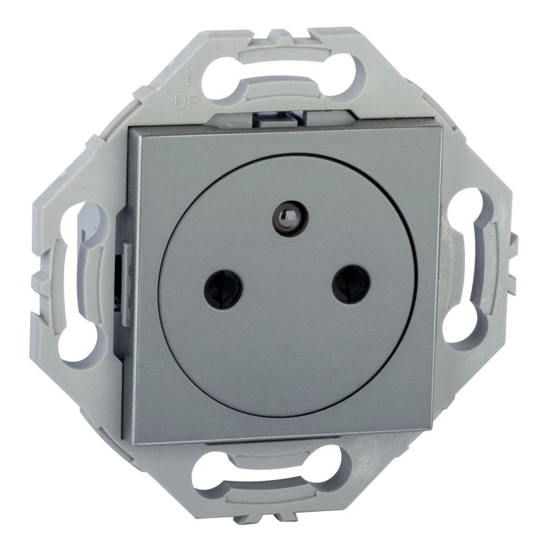 Prise électrique affleurante avec plaque de finition. Cette prise de courant de couleur gris alu dispose d’un système de fixation à vis sur boîte d’encastrement avec connexions automatiques..Son système affleurant permet d’éviter la présence de poussière dans la prise, de faciliter l’insertion de la fiche de l’appareil…