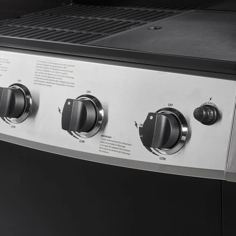 Grâce à ses 4 feux indépendants + 1 feu latéral et sa large surface de cuisson, vous pourrez cuisinez différents ingrédients simultanément en gérant différentes températures de cuisson. Une montée en température rapide et une cuisson saine et précise vous permettront de cuisiner dans des conditions optimales ! Livré avec une grille et une plancha, expérimentez de nombreuses recettes grâce à cette double surface de cuisson. La surface totale est 50% grille de cuisson et 50% plancha.