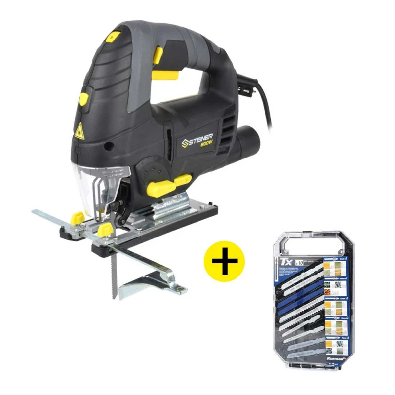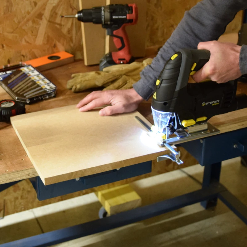 Cette scie sauteuse pendulaire 800W vous permettra de réaliser des coupes difficiles et précises sans l’effort d’une scie classique. La fonction pendulaire 4 positions et sa lame bois vous permettra des découpes de planches jusqu’à 110mm !