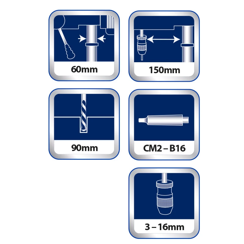 Grâce à son socle, sa table de travail et sa tête en fonte montée sur sa colonne en acier de 60mm, cette perceuse à colonne de haute qualité très robuste vous garantira un travail précis et efficace en toute circonstance.
