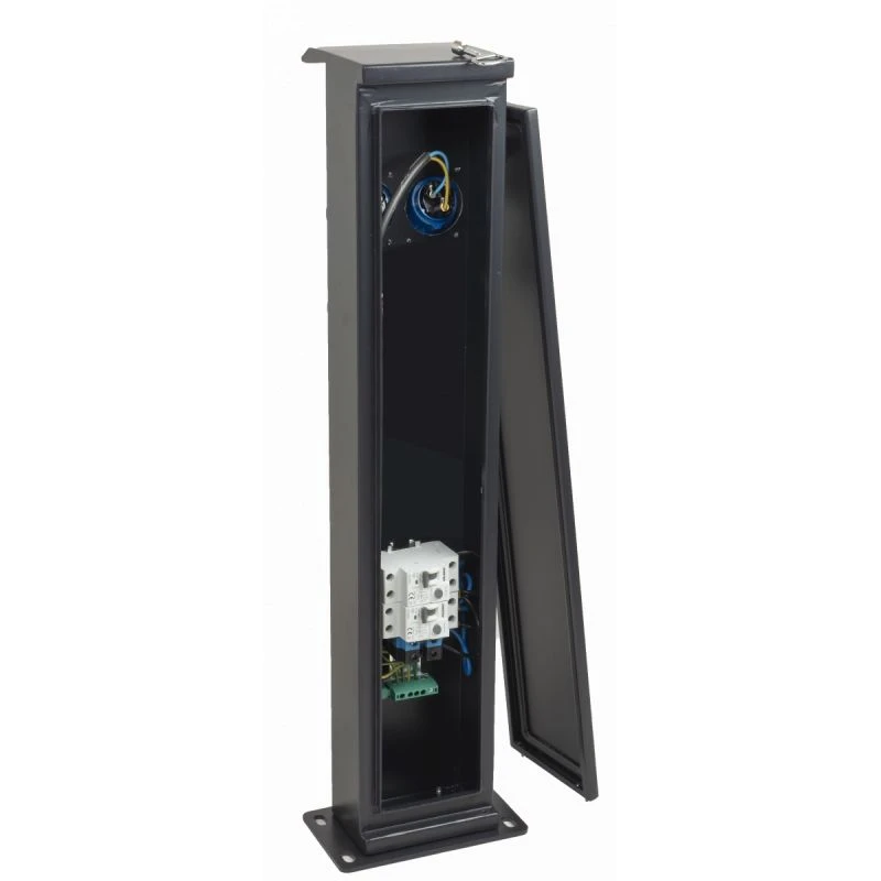 Chaque prise est protégée séparément par un disjoncteur différentiel. Un bornier phase/ neutre/ terre permet de raccorder très simplement l’alimentation électrique du produit. Une porte d’accès est située sur l’arrière du potelet métallique.