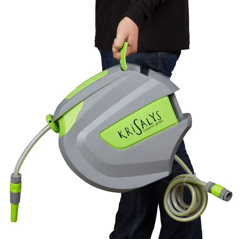 Pratique grâce à son enroulement automatique contrôlé, cet enrouleur de tuyau d’arrosage vous permettra d’arroser votre jardin sans contrainte de rangement du tuyau d’arrosage classique. D’une longueur de 20m, ce dévidoir automatique mural pour jardin pivotant à 180° est compact et performant et sera idéal pour l’arrosage de tous les jardins.