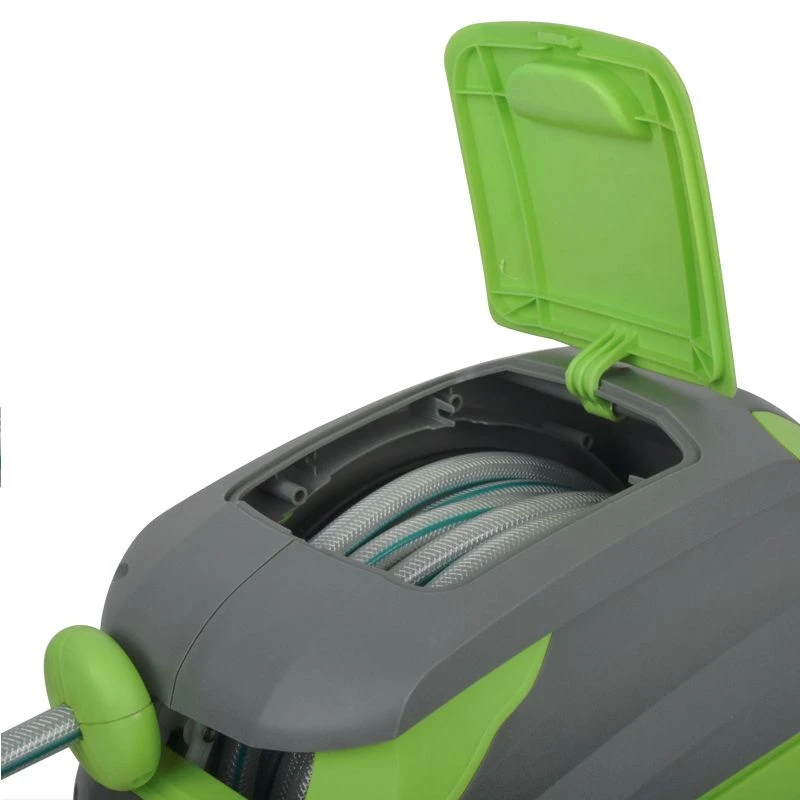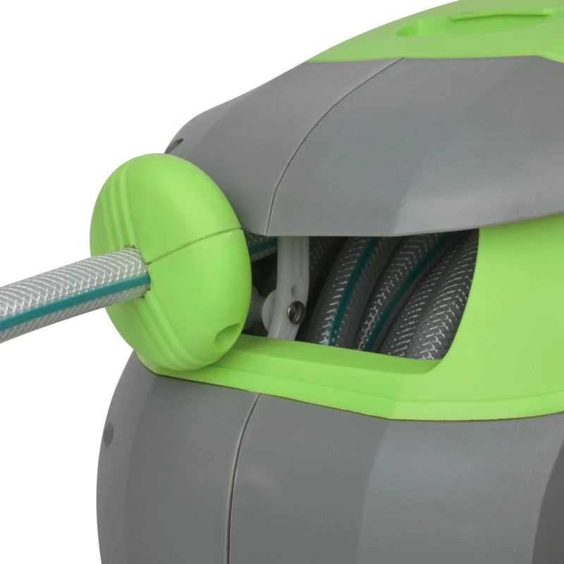– Equipé d’une roue à cliquet pour bloquer le tuyau à la longueur souhaitée et d’un détendeur pour faciliter le déploiement et la rétractation du tuyau